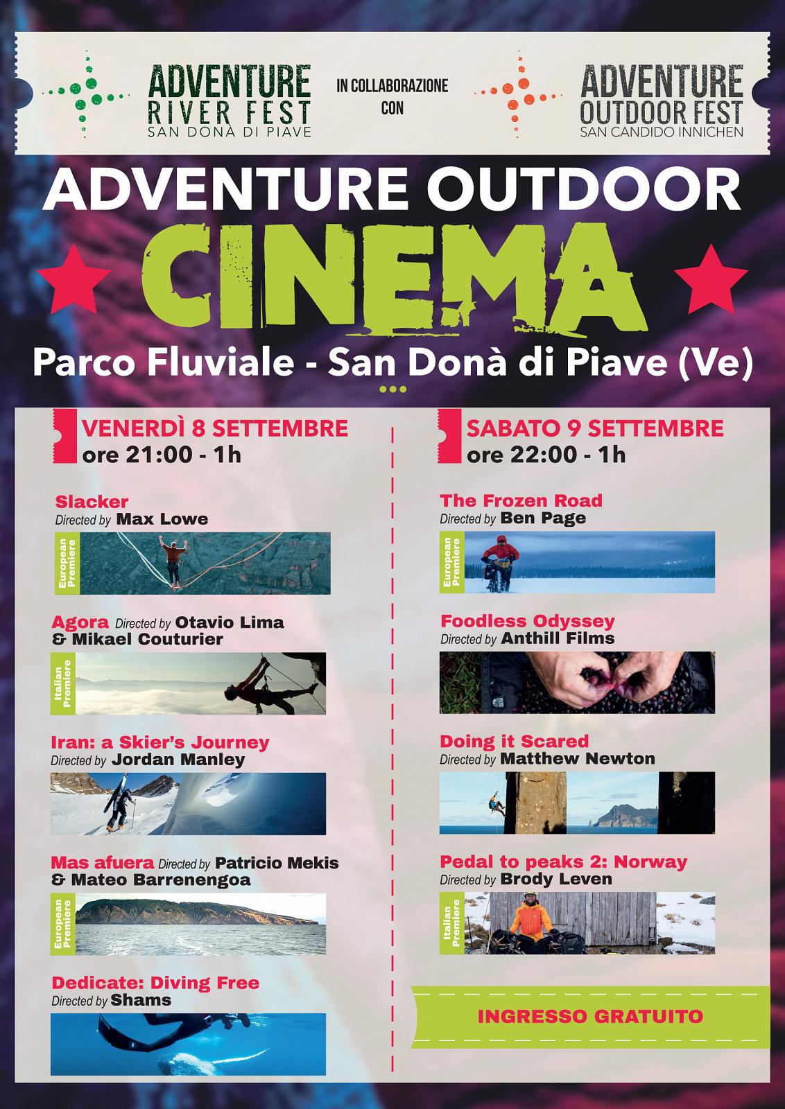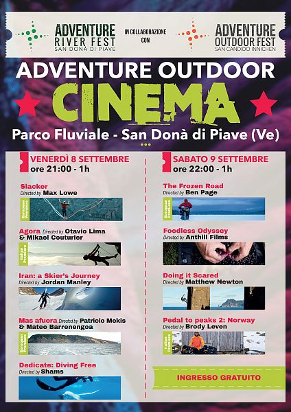 L'Adventure River Cinema è un appuntamento in cui, presso il cinema all'aperto allestito nel verde del Parco Fluviale di San Donà di Piave, sarà possibile vedere una selezione di alcuni spettacolari cortometraggi in concorso quest'anno all'Adventure Outdoor Fest.