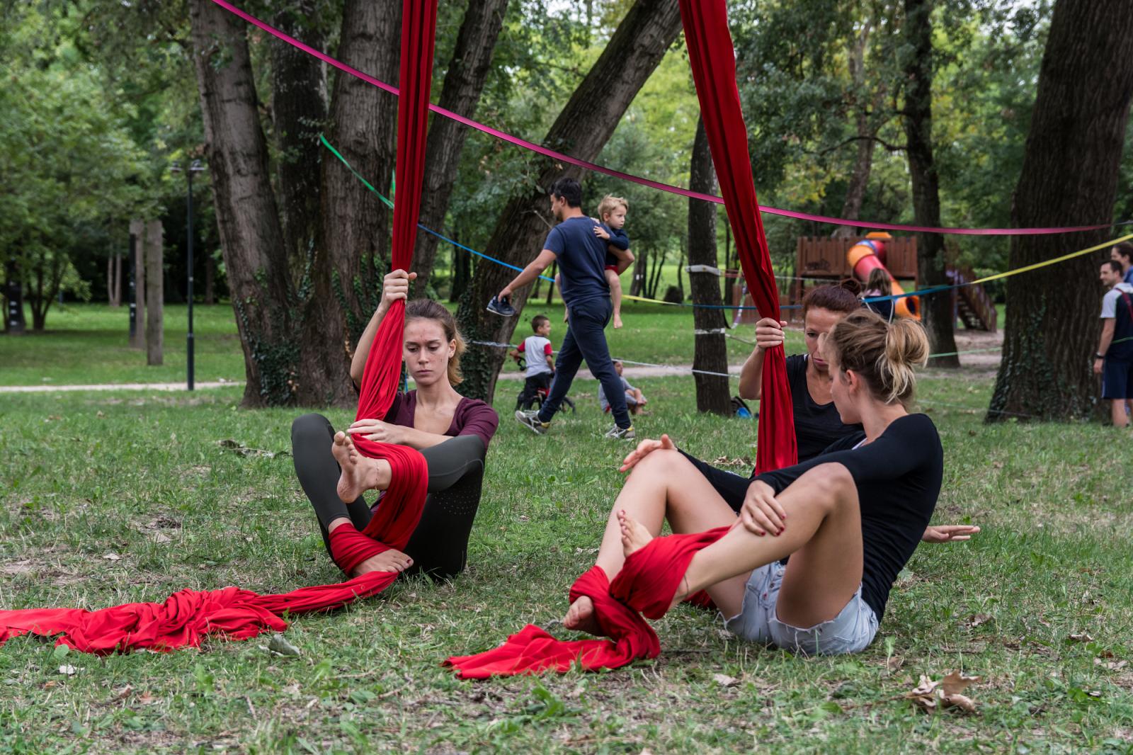 La disciplina del tessuto aereo nasce dal mondo circense: un doppio tessuto morbido sospeso viene utilizzato per creare con il corpo posizioni statiche e figure dinamiche nell’aria.